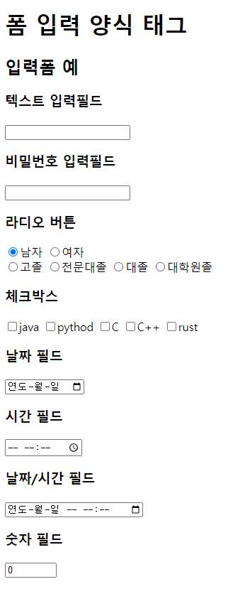| <input type = "datetime" /> | 날짜/시간 입력필드를 추가한다 |