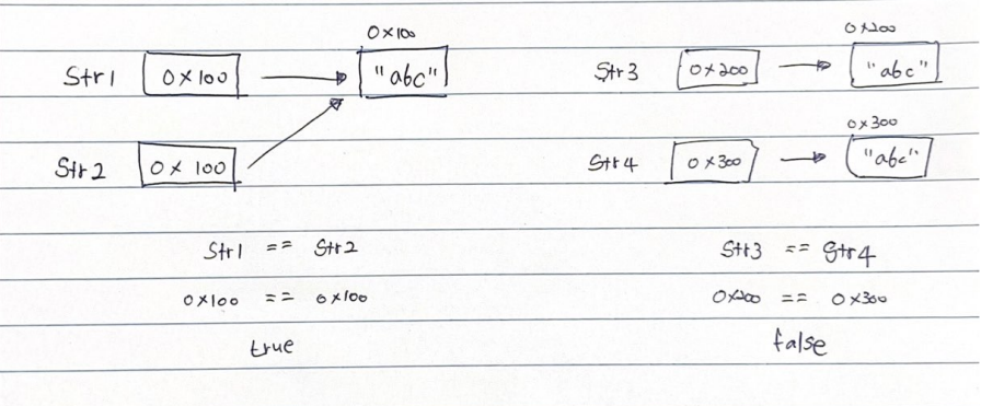 equals()를 사용했을 때는 두 문자열의 내용("abc")을 비교하기 때문에 두 경우 모두 true 결과를 얻지만, String 인스턴스의 주소를 등가비교연산자 '=='로 비교했을 때는 결과가 다르다