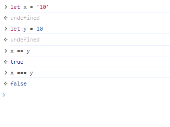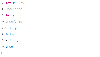 x !== y // true 두 값이 서로 다른값이라고 판단, !== 은 타입이 다르거나, 값이 다르면 true