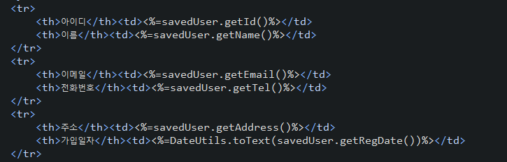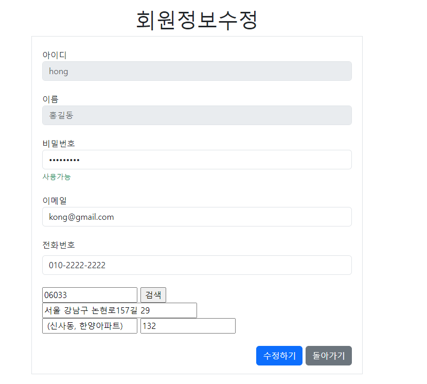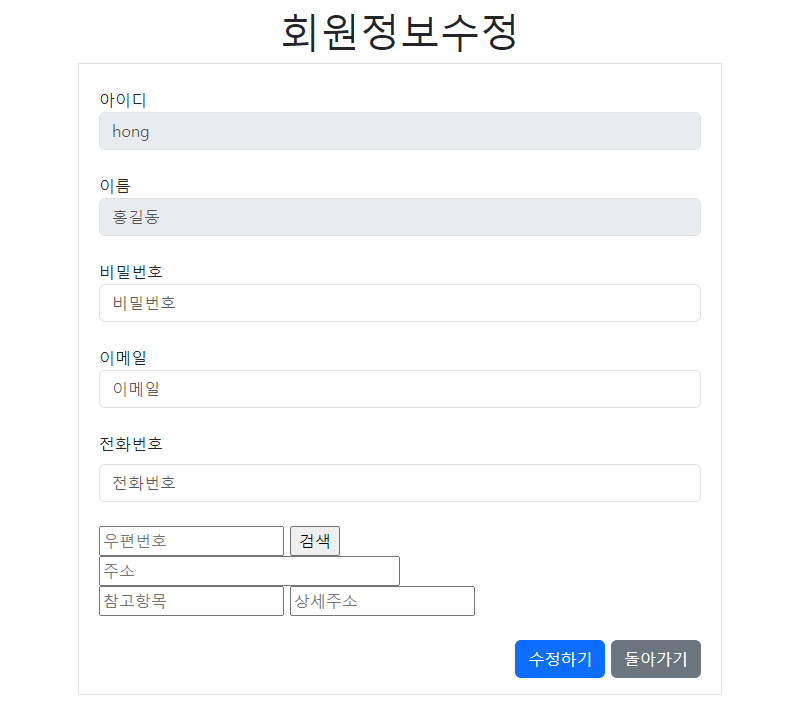 위 회원정보수정 페이지 사진처럼 객체에 있는 아이디 값과 이름 값을 화면에 출력할 수 있다