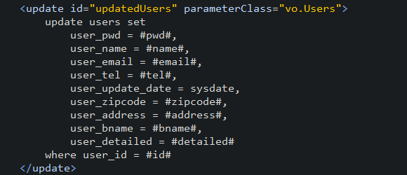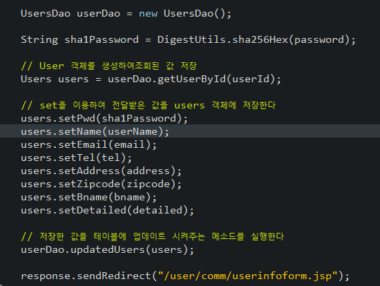 그리고 변수에 저장한 파라미터 값들을 set 메소드를 통해서 Users객체에 넣어주고 UsersDao의 updatedUses 메소드 실행
