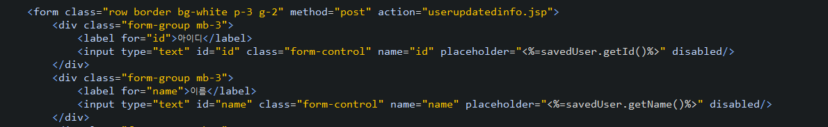 아이디와 이름은 바뀔수 없게하기 위해서 disabled코드를 사용했다