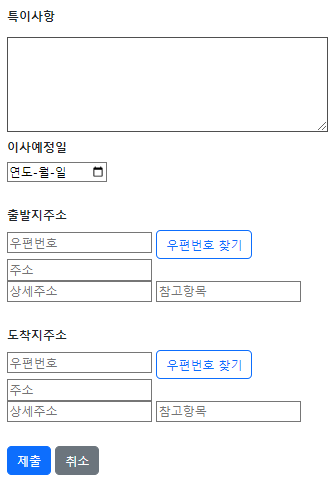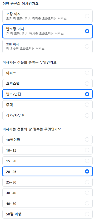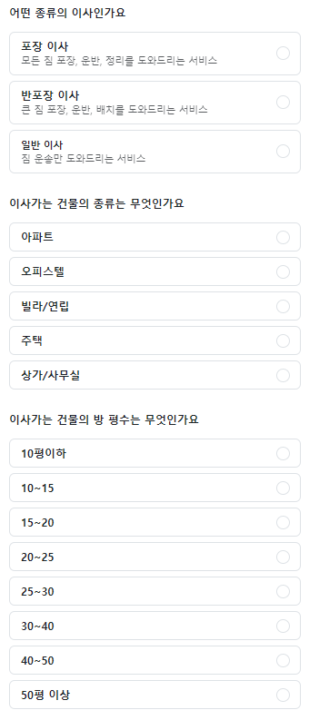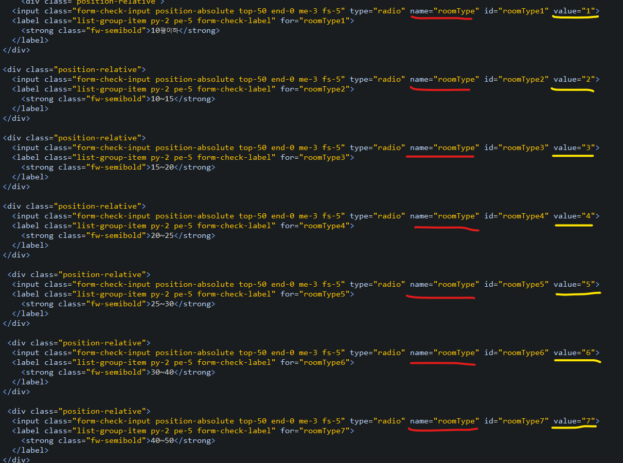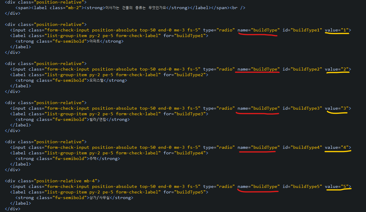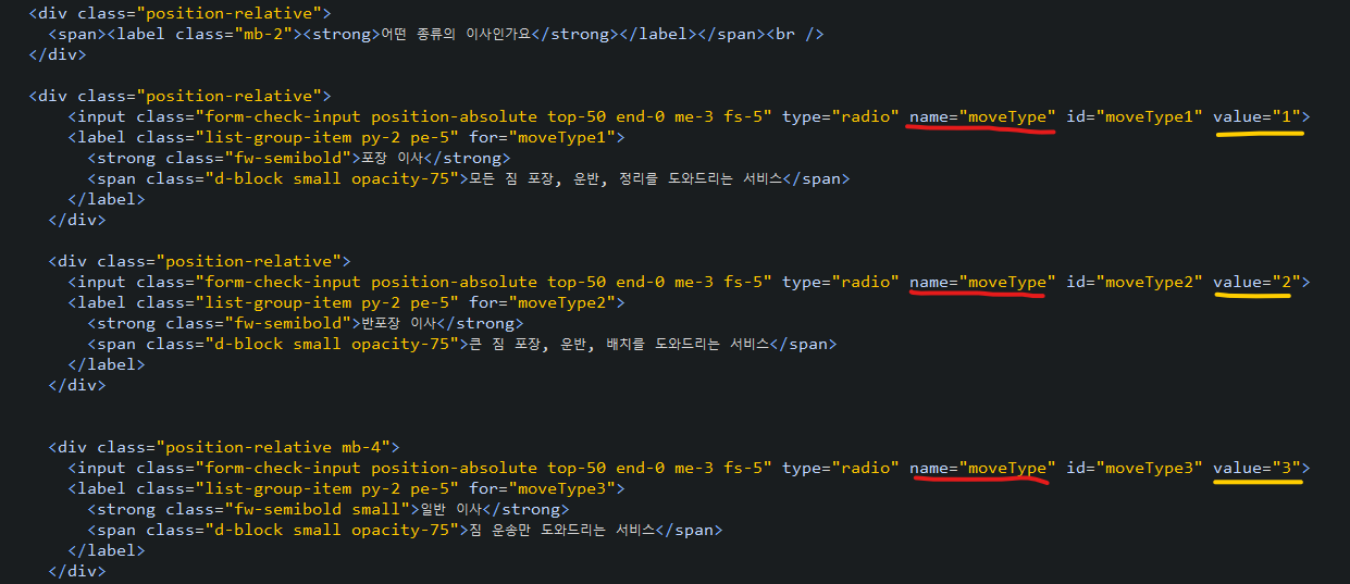 예시를 들어 어떤 종류의 이사를 하는지 고르는 영역에서의 name은 다 동일하게 moveType 이지만 value의 값들은 1, 2, 3으로 다 다르다