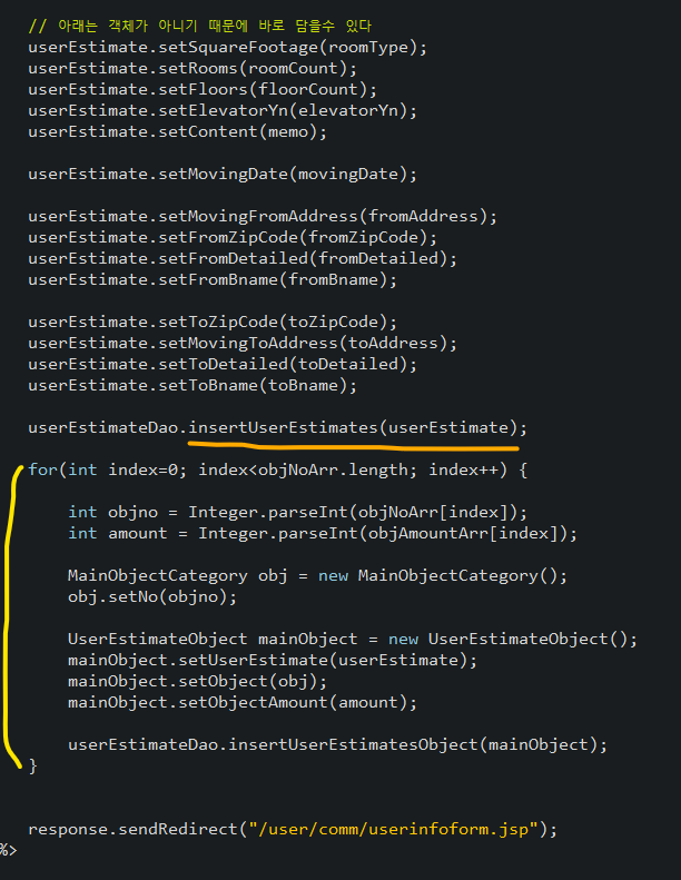 UserEstimateObject 는 주요 물품을 저장하는 테이블인데 파라미터값들을 배열로 저장해서 for문을 통해