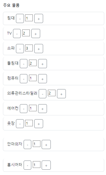 다른 타입들과 달리 여러개 있을 수 있는 부분이라 숫자를 가운데 두고 양 옆에 '-' '+' 버튼을 누르면 숫자가 줄어들게 해놨다