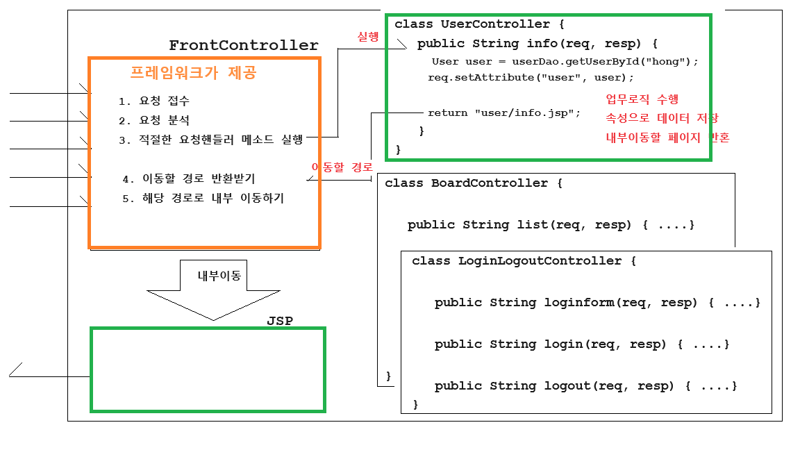 - 프론트컨트롤러는 요청핸들러 메소드가 반환한 JSP 경로로 내부이동해서 JSP를 실행한다.