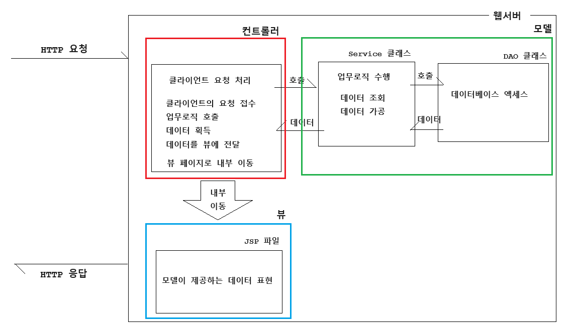 | 컨트롤러(Controller) | 실제 비즈니스 로직을 처리하는 구성요소. 프론트 컨트롤러에 의해 호출되어 요청을 처리하고, 필요에 따라 모델을 업데이트하고 뷰를 선택한다 |