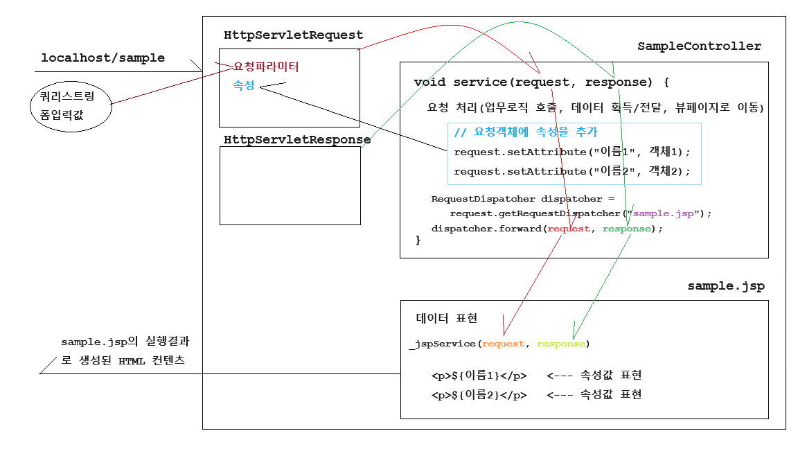 - 요청핸들러 메소드는 획득된 데이터를 뷰에 전달하기 위해서 요청객체에 속성으로 저장한다.