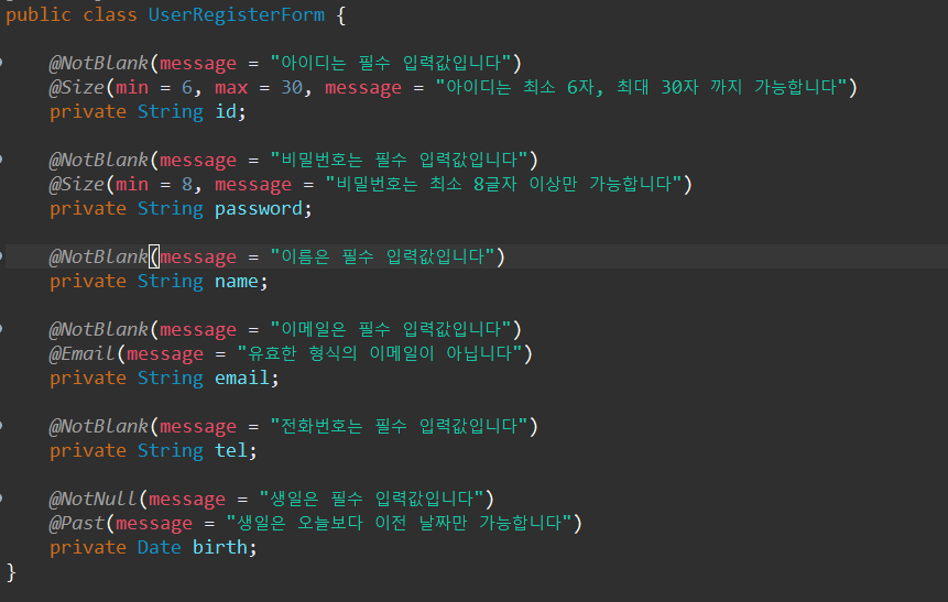 UserRegisterForm 객체의 어노테이션을 참고해서 유효성 체크를 수행하고, 위반사항이 있을 경우 BindingResult 객체에 Field Error를 저장한다