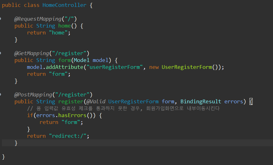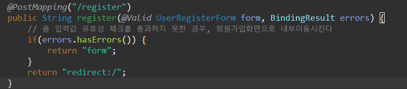 요청핸들러 메소드에 폼 입력값이 저장된 UserRegisterForm 객체와 유효성 체크 결과가 저장된 BindingResult 객체를 전달한다