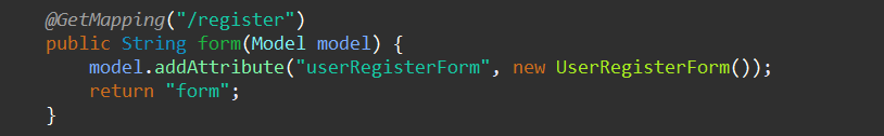 "userRegisterForm" 이라는 이름으로 UserRegisterForm 객체를 Model 객체에 담아서 전달하는 역할을 수행한다
