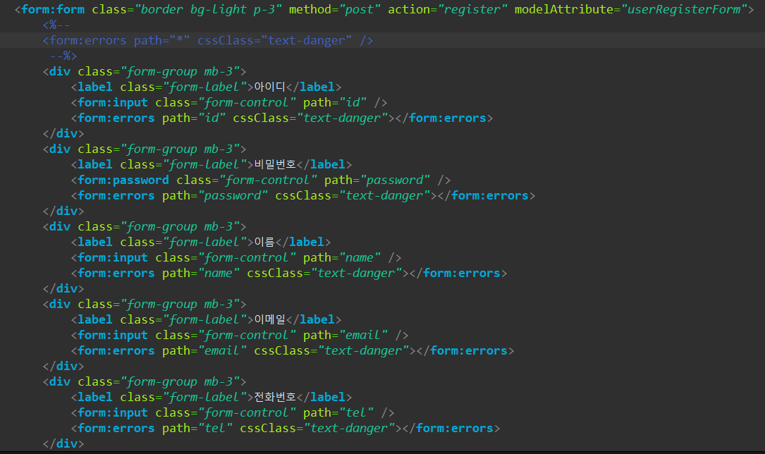 form.jsp에서는 "userRegisterForm" 으로 저장된 UserRegisterForm 객체를 찾아서 입력필드에 값을 표현한다