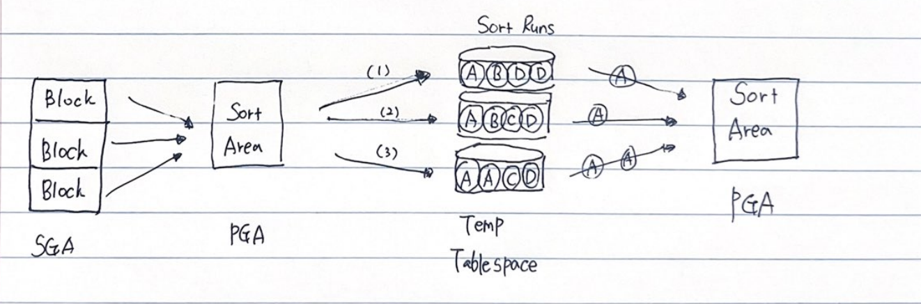 소트는 기본적으로 PGA에 할당한 Sort Area에서 이루어진다 . Sort Area가 다 차면 디스크 Temp 테이블 스페이스를 활용한다.