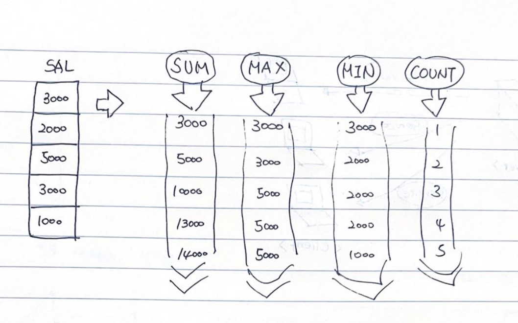 EMP 테이블 레코드를 하나씩 읽어 내려가면서 SUM 변수에는 값을 누적 / MAX 변수에는 기존보다 큰 값이 나타날때 마다 값 대체 / MIN 변수에는 기존보다 작은 값 나타날때 마다 값 대체 / COUNT 변수에는 SAL 값이 NULL이 아닌 레코드 만날 때마다 1씩 증가
