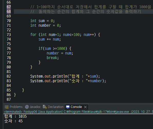 그리고 1000을 넘었을 때 어디까지 반복되어 있는지 확인하기 위한 int 타입의 변수 num을 변수 number의 대입해서 몇번째에 1000을 넘었는지 알 수 있게 출력하는 코드이다.