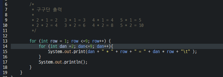 안에 있는 for문이 옆으로 출력되며 단이 계속 하나씩 올라가고