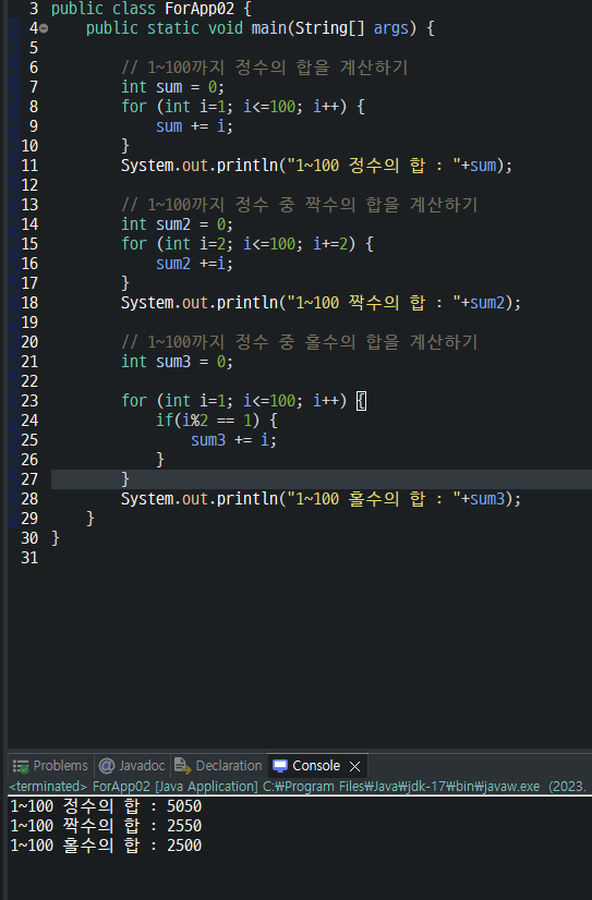 for문을 활용해서 1~100까지의 합, 1~100까지 짝수끼리의 합과 홀수끼리의 합을 구하는 코드이다.