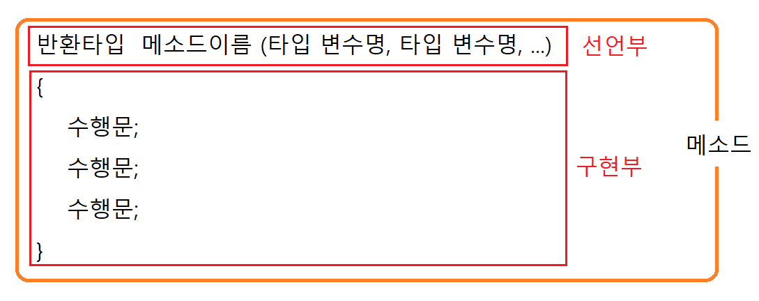 메소드의 구성은 선언부와 구현부로 구성되어 있다