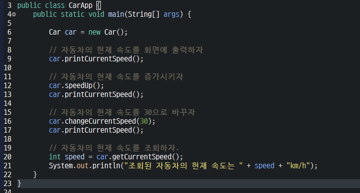 메소드의 구현부는 해당 메소드가 수행하는 작업에 대한 수행문이 포함되어 있다.