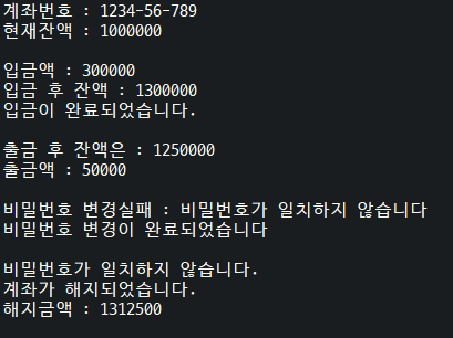 // 계좌정보 객체를 생성하고, 조회,입금,출금,비밀번호변경,해지 기능 사용해보기