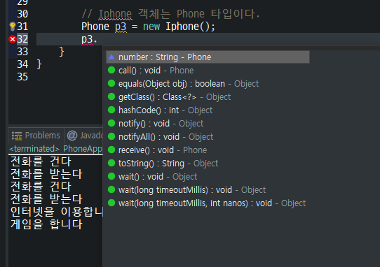 Iphone객체를 생성해서 Phone타입의 참조변수로 참조하고 있다