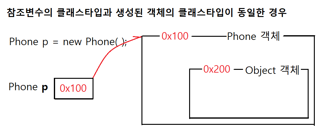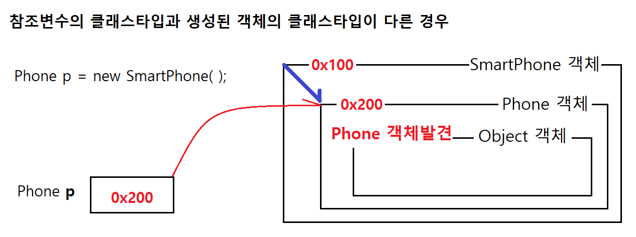 참조변수 p2는 참조변수 p1이 참조하는 객체를 구성하고 있는 객체들 중에서 SmartPhone 객체를 탐색해서 그 객체의 주소값을 참조변수 p2에 대입한다