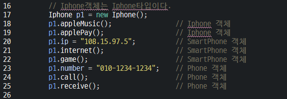 SmartPhone p23 = new Iphone(); // 성공 자식객체를 상위타입 참조변수에 대입