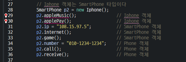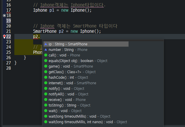 위 코드를 예시로 들면 p23의 참조변수는 Iphone 객체의 주소값을 가리키는 것이 아닌 SmartPhone 객체의 주소값을 가르킨다.