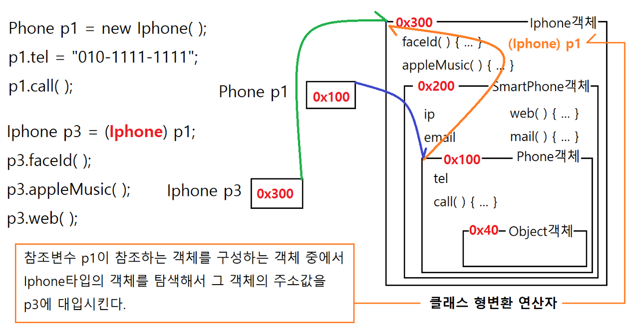 참조변수 p3는 참조변수 p1이 참조하는 객체를 구성하고 객체들 중에서 Iphone 객체를 탐색해서 그 객체의 주소값을 참조변수 p3에 대입한다