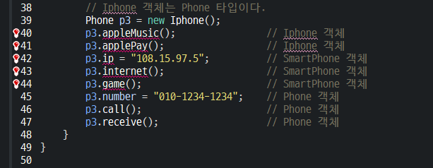 이 코드도 위 SmartPhone p23 예시처럼 Iphone 객체의 주소값을 가리키는 것이 아닌 Phone 객체의 주소값을 가르킨다