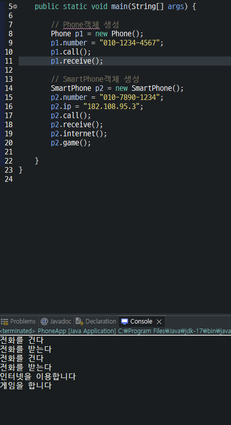 위 코드는 Phone 객체가 존재하고, Phone 객체를 상속받은 SmartPhone객체