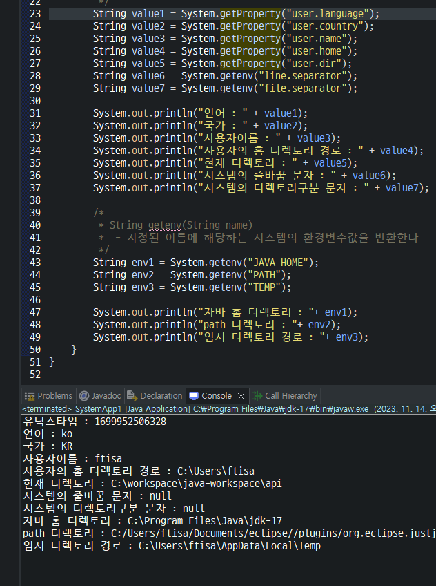 - 자바실행환경이 설치된 시스템(컴퓨터)에 대한 유용한 값과 객체를 제공하는 클래스다.