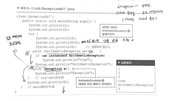 위 사진처럼 try - catch 문의 마지막에 Exception 클래스 타입의 참조변수를 선언한 catch블럭을 사용하면