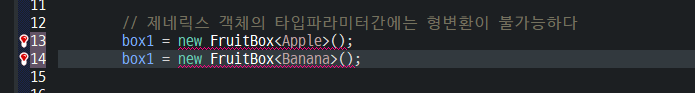 제네릭 객체의 타입 파라미터끼리는 형변환이 불가능한 것을 알 수 있다