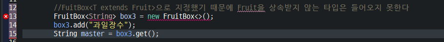 FruitBox 제네릭 클래스에 타입 파라미터를 <T extends Fruit> 으로 지정했기 때문에 Fruit 객체와 Fruit을 상속받은 객체들만 사용할 수 있음을 알 수 있다