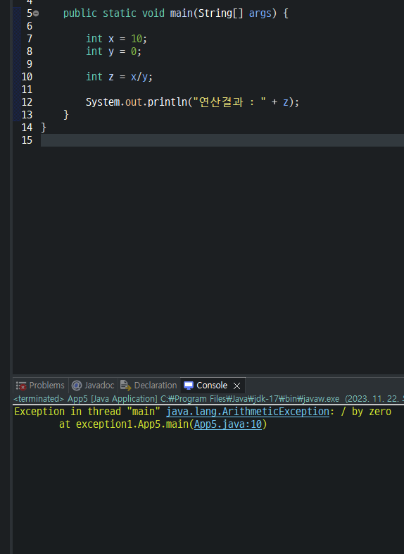 | ArithmeticException | 나눗셈에서 어떤 값을 0으로 나눌 때 발생하는 예외 클래스 |