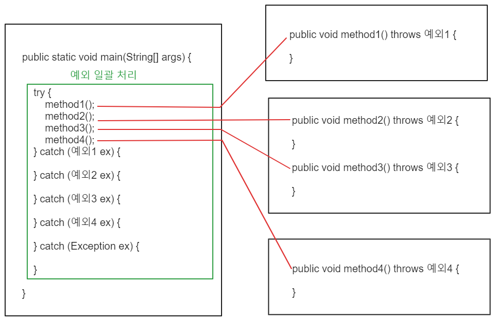 - 발생이 예상되는 예외들이 부모-자식 관계가 아닐때는 순서와 상관없이 catch 블록을 구성해도 된다