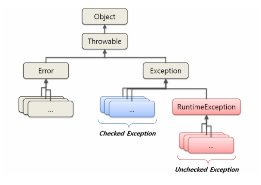 - 예외는 개발자의 코딩실수나 사용자의 잘못된 프로그램 사용으로 발생하는 오류