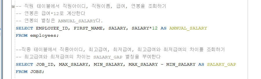 SELECT 컬럼명 as 별칭, 컬럼명 as "별칭", 연산식 as 별칭, ...