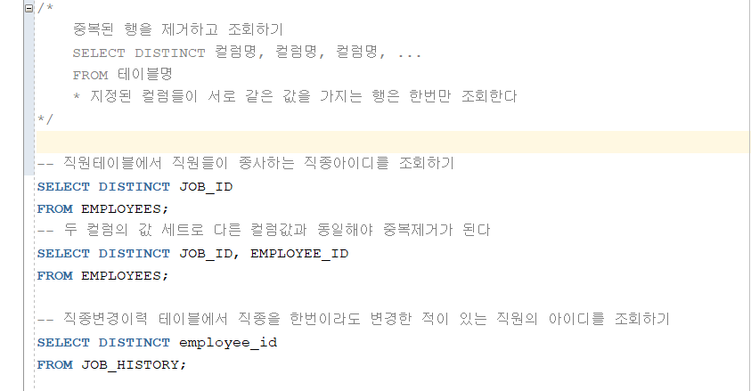 - 동일한 컬럼값을 가진 행이 한 번만 조회된다