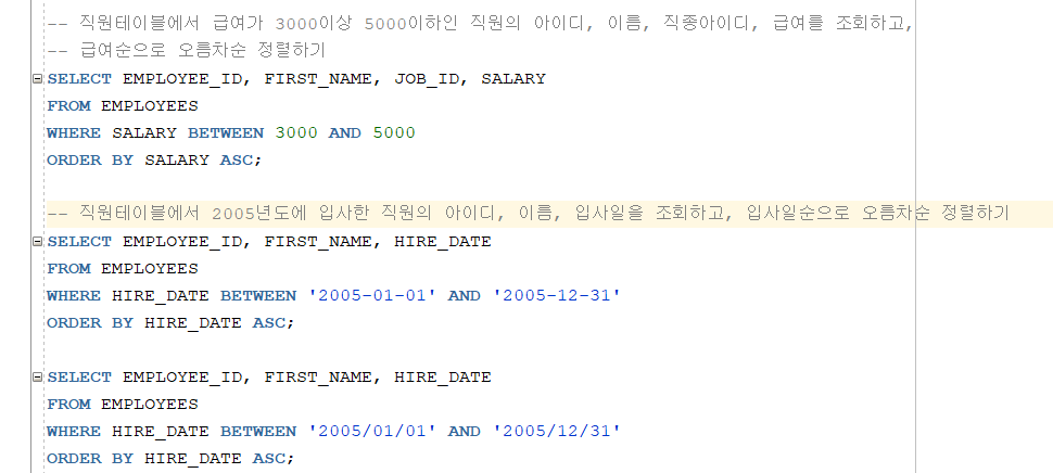 WHERE 컬럼명 BETWEEN 값 AND 값;