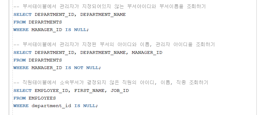 - IS NULL : 컬럼의 값이 NULL인 행이면 TRUE 출력