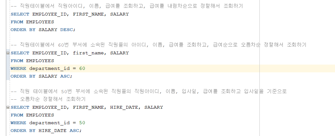 - ASC는 오름차순, DESC 오름차순. (생략하면 자동으로 오름차순으로 정렬한다)