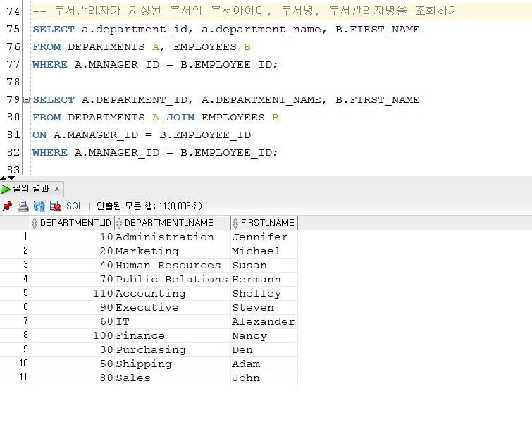 - 부서테이블에는 부서번호, 부서명, 위치가 있다