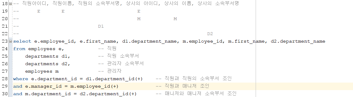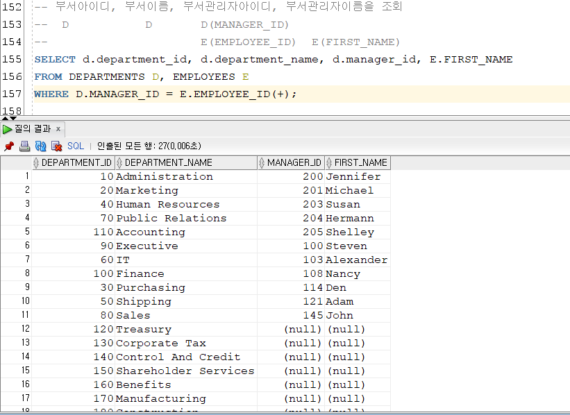 - 등가조인, 비등가조인은 조회하려는 데이터들이 조인에 참여하는 모든 테이블에 데이터가 존재하는 경우에만 조회된다