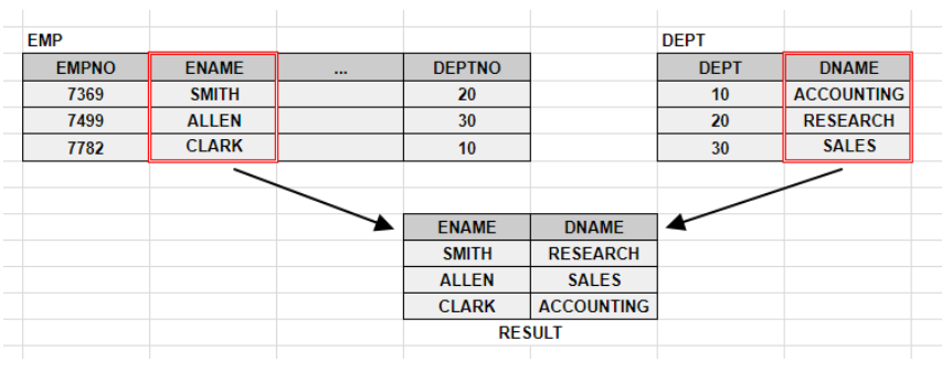 - 사원테이블과 부서테이블의 각각의 행을 서로 연관있는 행끼리 연결지어서 새로운 가상의 테이블을 만들고, 그 테이블로부터 필요한 정보를 가져오는 것이다