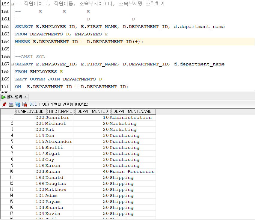 - 조인문법은 오라클에서만 사용되는 Oracle Join과 모든 RDBMS에서 공통적으로 사용하는 ANSI(표준) Join이 있다