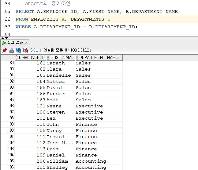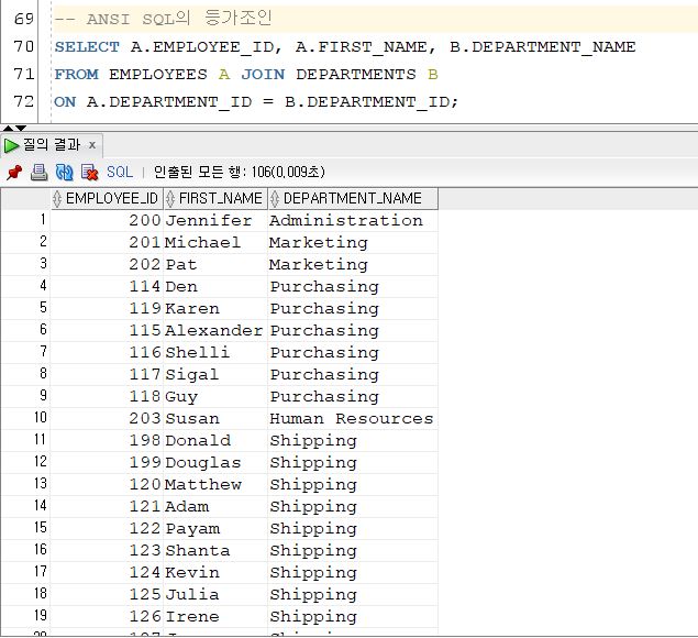 - 등가조인은 선행 테이블에서 데이터를 가져온 후 조인 조건절을 검사해서 동일한 값을 가진 데이터를 후행 테이블에서 꺼내오는 방법이다