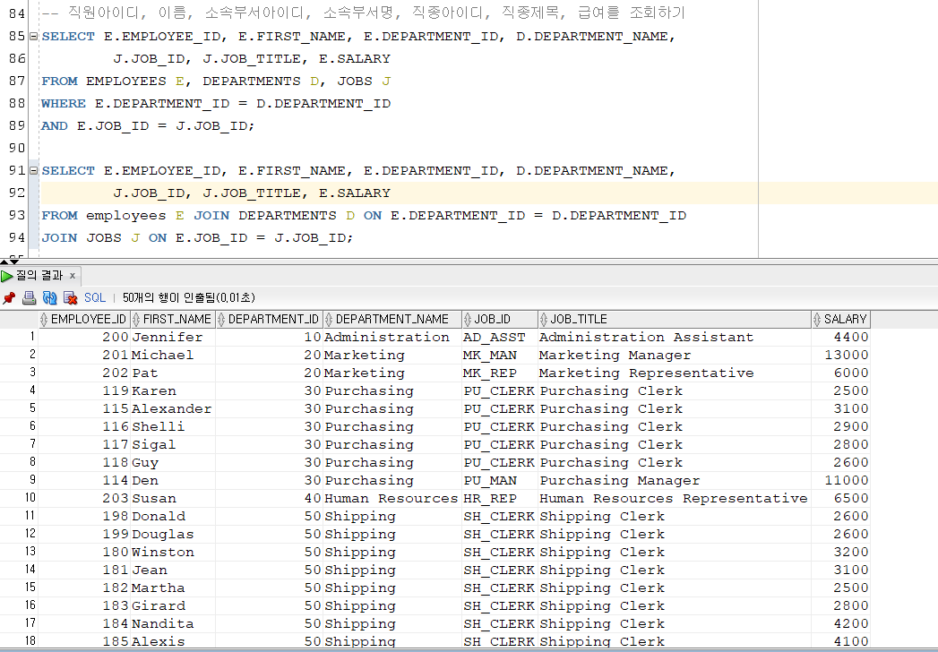 = 테이블의 조인은 조인대상이 되는 테이블의 이름을 FROM절에 나열하기만 하면된다