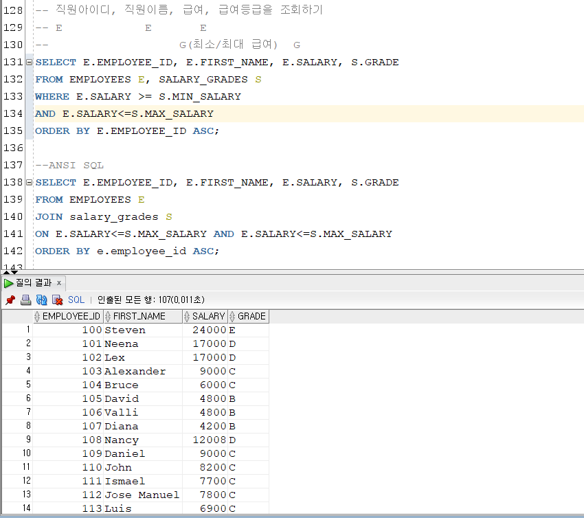 - 조인조건을 지정할 때 조인 대상테이블에서 같은 값을 가진데이터를 가져오는 대신, 크거나 작은 경우의 조건으로 데이터를 조회하는 조인 방식이 비등가 조인이다.